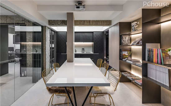 近20坪的水泥方盒里,经过反覆推敲、琢磨,重新定向空间节点和光源路径,以减法建构空间,以加法铺陈细节,并尽可能地引进日光,留存质材纹脉,让小单元划分的场域性质,有条不紊各得其所。施工初期,原想拆除量体所有隔间,以达到最大限度的通透宽敞,然而却桎梏于原有的梁柱结构,遂而顺势与之和平共处,转化为中岛会议桌,不仅将缺陷转为特点,更让整体空间更添旨趣。