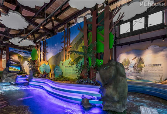 而在片片白云指路下,游客最后来到充满流水意象的「溪流馆」,以丰富的水域生态为基础,随处可见崎岖石块及闪烁波光,沿着特殊的灯光穿行于微暗空间,彷彿探身水下世界;曲型的镂空阶梯搭配间接灯源,使瀑布河阶的天然层序有了另一种诠释,当人逆流而上趋近高层展板时,细腻的介绍文字与感应互动反应这才浮现眼前,悄悄贴合参观展馆及游历自然的行为模式。