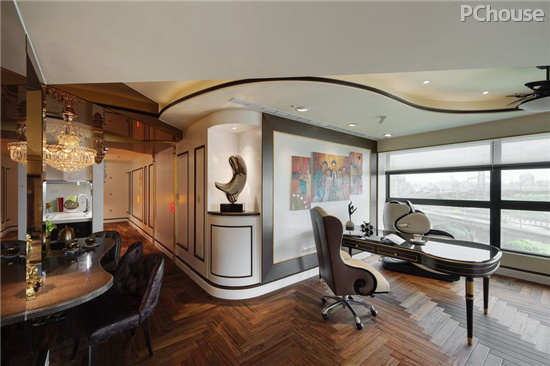 此外,天花板则在古典方正与现代流线对照下,轻巧划出阅览区块;当投影布幕升起,专属一家人的电影院便于此开启,其后的阅览区块亦化身独立书房,以悬挂墙心的全家福为中心,将家人紧密相依却各自独立的核心价值就此彰显。