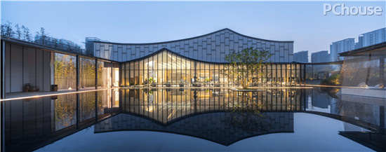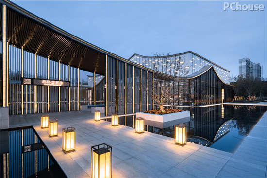 从建筑外观造型到室内空间结构,取意于中国传统建筑,又经现代设计之后呈现出柔和洗练的几何造型。其高低错落,韵律之美感,构成统一的视觉韵味。水墨画般利落的笔触,描绘出人们心目中对徽派民居的情结。一座城市、一方水土独有的文化肌理,经过设计者的提炼再创造,创造出有记忆的情感体验。
