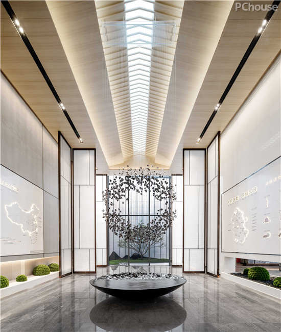 洽谈区的天花设计让整个室内空间灵动且独特。室内天花纵深处与建筑外立面的人字形呼应。中间绵延的弧形造型柔化了空间,如波纹流转的衔接处,格栅的设计将自然天光引入室内,抬头仰望,既呼应了如前厅屋顶设计般的天空遐想,也让光线自此倾泻,“让光线作设计”。天花造型的灵感源于中国房屋的最初轮廓——瓦当,它象征着中国传统建筑最根本的生活内涵。结合出风口,强化了形态,使之更切合传统屋顶结构的意向,让人在记忆中找寻回内心深处对于家的最初印象。
