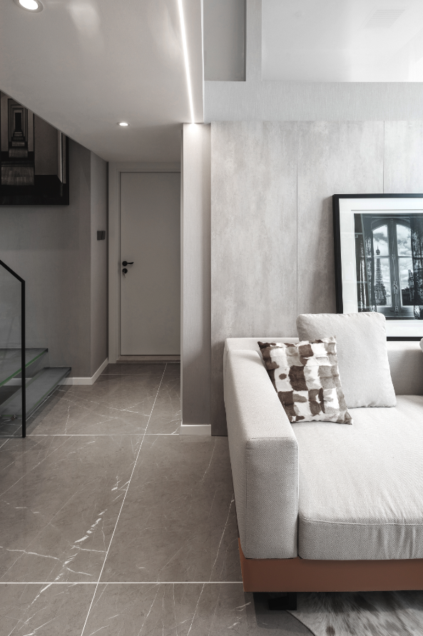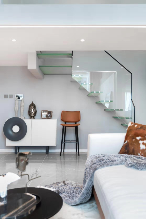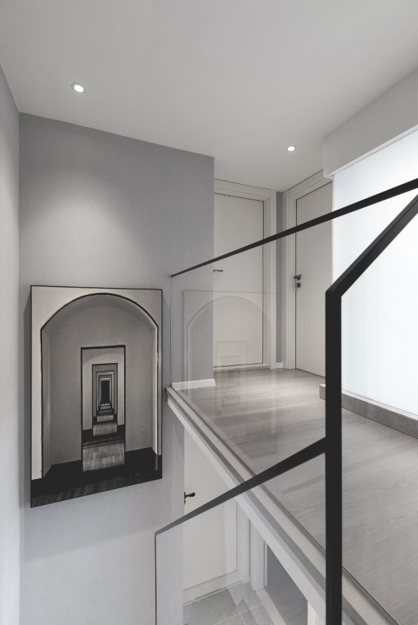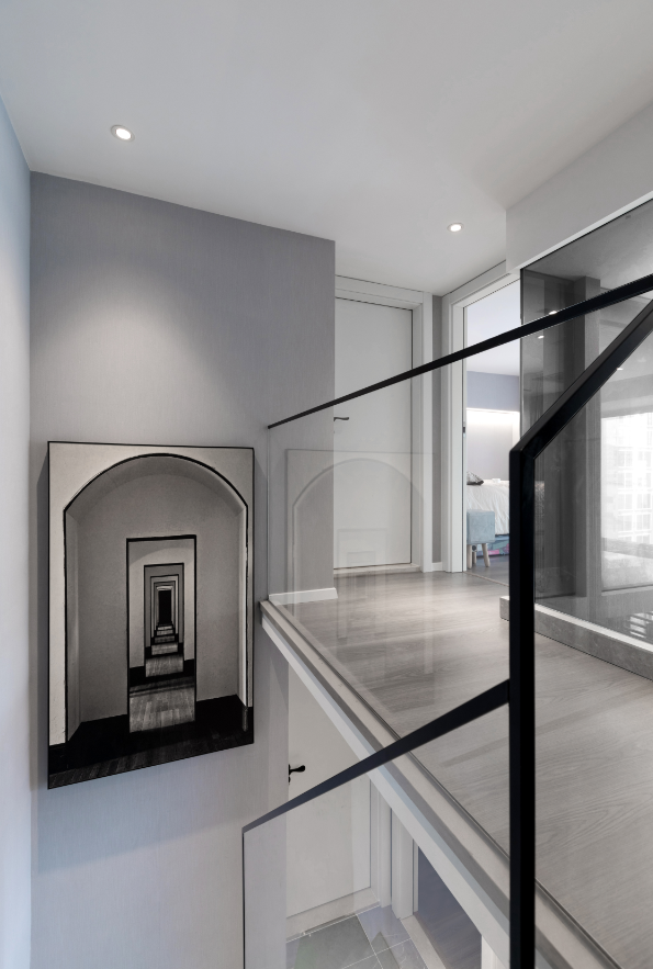 连接一层二层空间的楼梯选用玻璃材质作为建筑主体,灰色为主调的装饰画起到了点亮空间的作用,装饰画的加入也让空间更加的舒服自然,虽然没有繁复的装饰却处处体现着设计师的用心和细心。
