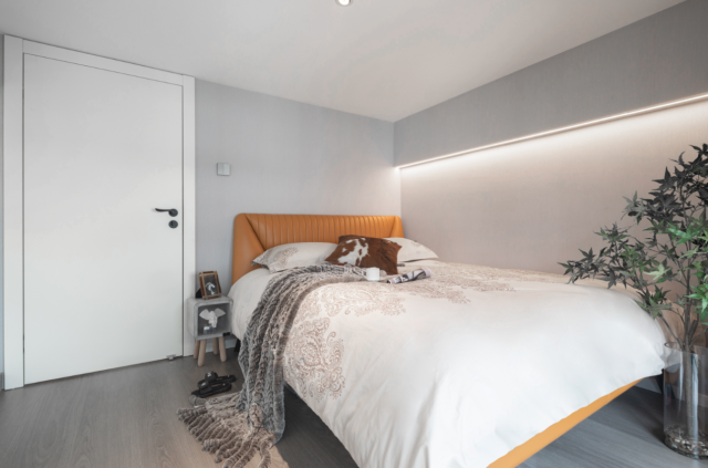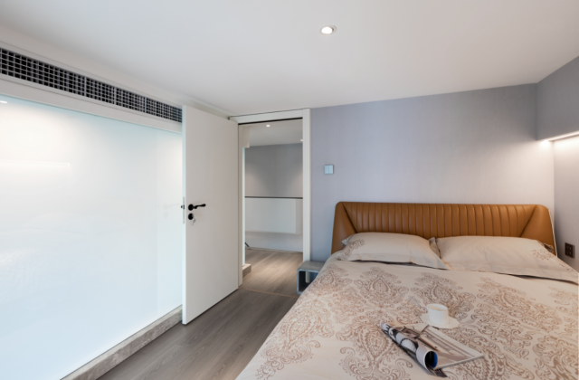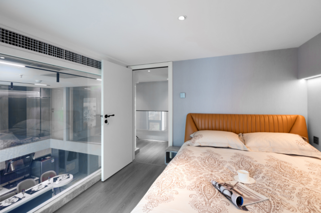 无论是卧室还是女儿房,在设计上均实现了通透性和私密性。运用了通电玻璃幕墙,通过不同的开启方式,打开了一楼活动区与二楼休息区的动静秩序,形成既独立又共享的并存关系,灵活、开放又便捷。