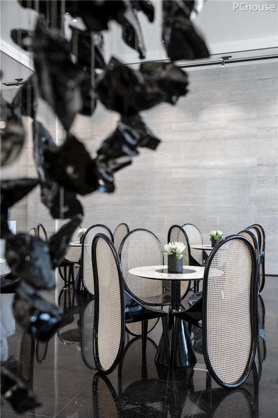 大小不一、材质形态各异的黑色圆形装置是水滴的具象化,交融出“疏雨滴空阶”的自然生趣。设计以一场视觉上于小中见大的震撼画面,营构出整个空间的精神高地,灵动与别致的气韵,在空间中自由流动游走,情思如澜。