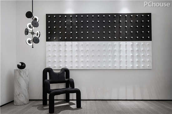 空间设计以黑白两色打造经典,焕发魅力,优雅新生。形制上采取新意倍出的设计元素:藤编的单椅、铆钉装饰的绒面沙发、清瘦简雅的瓶樽、抽象映趣的立体壁画……这里是艺术发生的场景,多种美学形式在空间中谱写优雅,空间情绪亦在此兼得一种新的轻松与充沛。