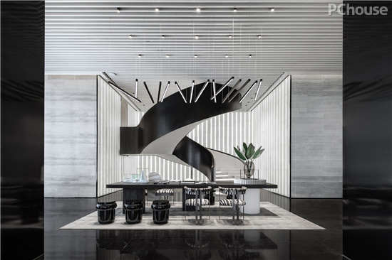 书吧以地毯界分出序列感清晰的空间区隔,搭配的家具软饰等均以黑白的简约视像与几何线条的层次感营造。其后的旋转楼梯承载着上升与延展的空间感,隐喻升腾而上的艺术精神,意境亦随之更显深邃。