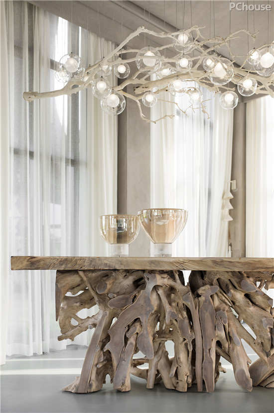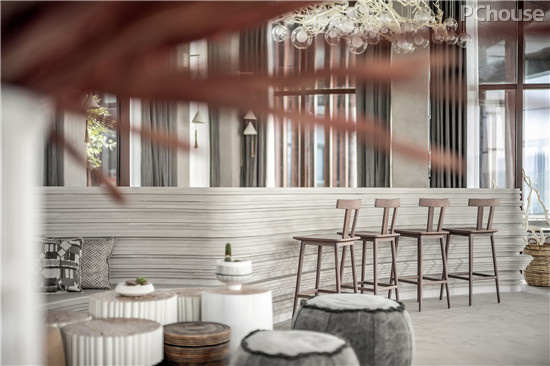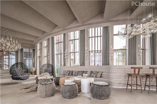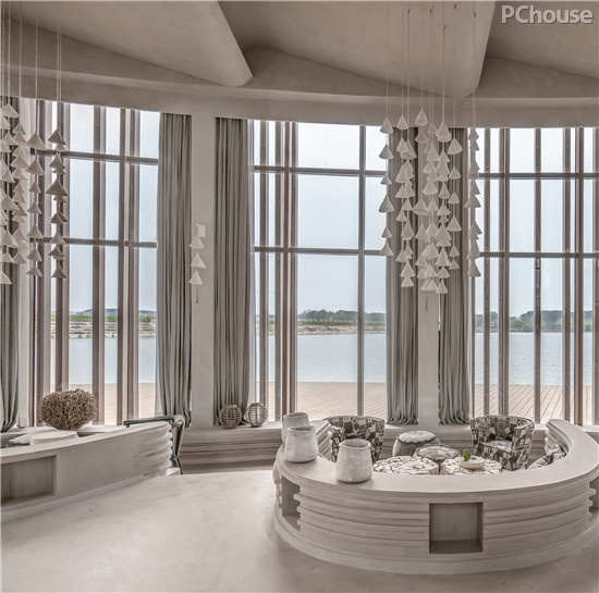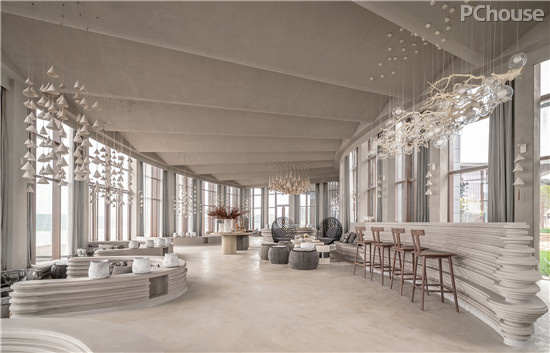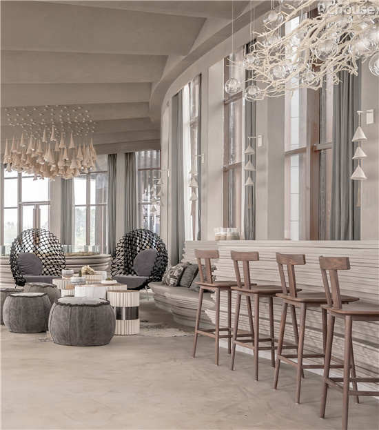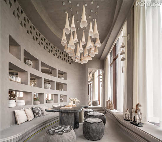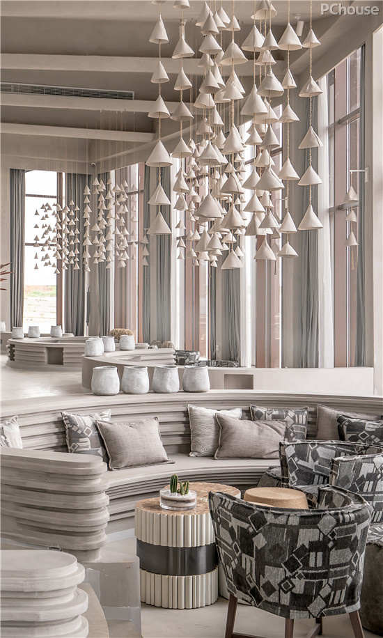 白色流线装饰下的座椅,仿佛长时间流水冲刷形成的岩穴。搭配着漂流木风格的桌椅摆件、软垫和枝状吊灯,这些座位成了一个个柔软又安全,能将人包裹起来的迷宫。