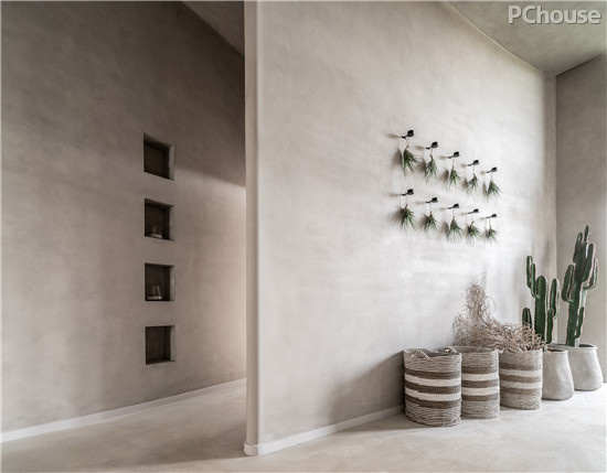 膏岩层的意象,在空间中被完美演绎。南区陶艺展示墙的点光源,反衬莫兰迪风格的陶器,粗砺的表面模拟着冲刷腐蚀的结果。北区以藤壶造型和手工质感的粗陶装饰,目光所及之处,轻易就能发现时间留下的划痕。已经风化成岩石色泽的动物头骨,进一步点染出“远离尘世”的风味。