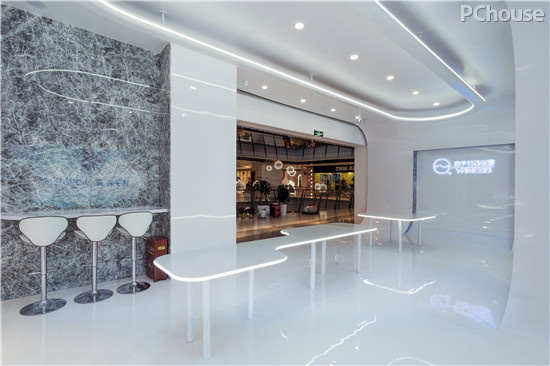 为体现空间的未来科技感,同时突出产品,在整体的材料选择上,采用混油木饰面及环氧地坪漆创造了纯粹的白色空间基调,地板与墙体连接处的弧面和天花板与墙体连接处的弧面均采用镀锌方管搭建造型骨架,地坪漆通过数码调控以达与墙面的无色差衔接,提供给参与者一种室内地面、天花和墙体一体化的高科技未来感的体验,不会喧宾夺主而是将注意力完全投注在产品上从而使得其特质得以最大化的呈现。