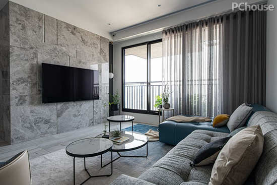 置身白净色域的客厅,运用简洁而方正的线条架构空间,并铺设灰质磁砖地板呼应大理石电视墙、灰漆饰带,以及灰蓝相间的齐顶壁柜,打点出温和的中性色调。