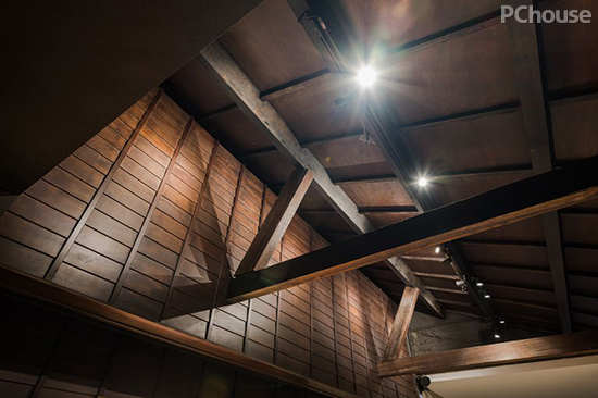屋舍内部前段挑高,使足步由阔至窄有如探幽,错落悬挂的长灯笼便成为引路灯,引人驱身向前同时目光环视——天幕由深胡桃色木材排闼构筑斜顶,顺势框塑裸露而出的朴素砖面,将视线凝聚于题有业主品牌名称的纸伞老件,使看似无奇的过门,也成为宣告时空转换的仪式。