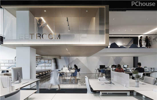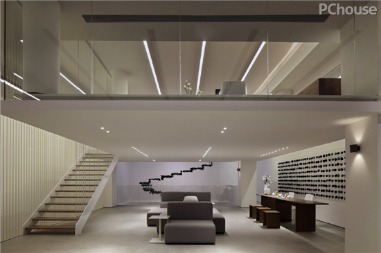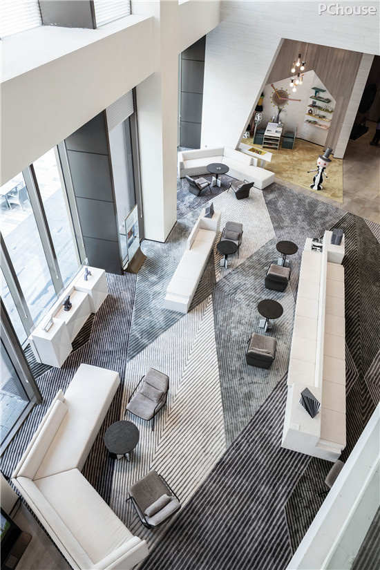 设计利用折面体分隔空间减缓进深的单调属性,采取长方体空间边长拉深光的反射和动线。一层大空间挑高却不平坦,二层位置做出骑楼折叠,打破规整的穿插形成空间交错,制造出漂浮的几何空间,丰富空间层次感。