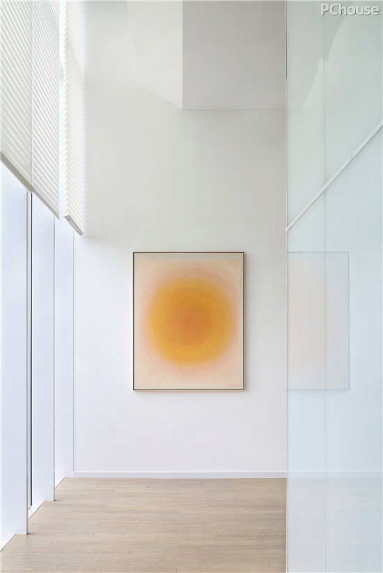 优越纵深与宽阔层高之上,迎面而至的光影斑驳洒在墙上,透光倾泻而出,室内光影流转,如同阳光穿过树叶,自然漫入室内,意境从抽象渐渐具象成形,此时已有别样心境。