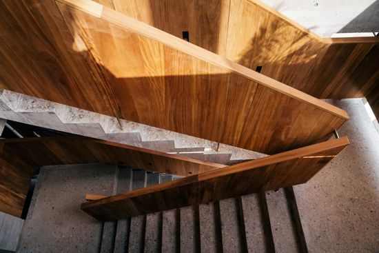 二楼为图书馆,包含一个室内图书馆和露天的读书区域,通向二层的楼梯设计富有几何感和趣味性,是专门供小朋友玩耍的空间。