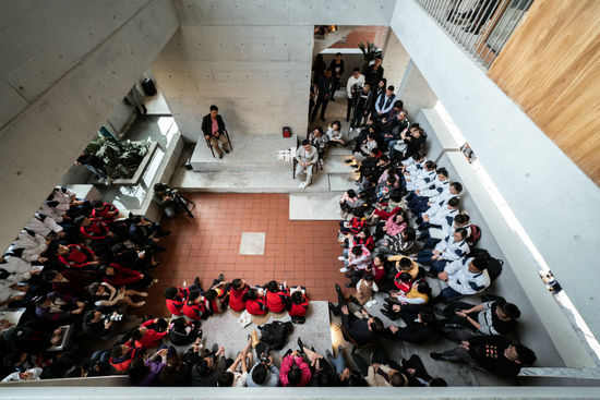 经过的重新规划后,建筑的一层以一个半开放式的文化讲堂为主,下沉式的公共空间与一面通高的清水墙面交相辉映,自然形成了一种庄重的氛围;与高处不同角度对望的视线关系,让整个空间变得生动起来。