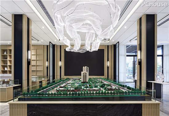 沙盘区的艺术吊灯,如云雾落入空间,又似涟漪圈圈散开,设计以现代手法演绎出山川自然的旷远与灵性、清幽与意趣,恰有一番“夫唯不争,而众美纷至沓来”的祥和静气之感。