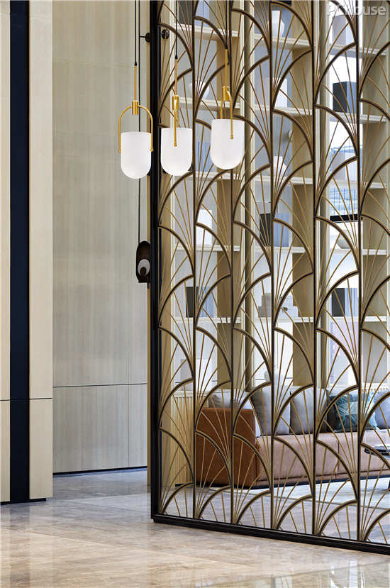 空间借镂空形制的屏风形成区隔的同时,亦不失通透性。屏风的意象取自轻柔的苇草,阳光穿透过其间的细缝,熹微且暖,将人的记忆点拉至田野麦浪中,光与暖并存,深入人心。