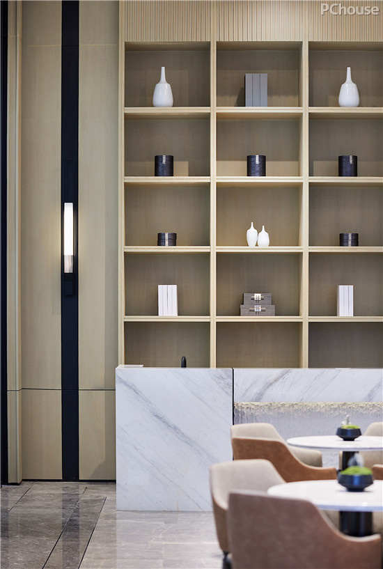 水吧区以粗粝与光滑相衔的材料搭建,材料丰富的表现力与层次感,在简雅的环境背景中被发挥到了极致。基于空间比例、功能使用、美学营造等考虑,鸿艺源在设计中规避不必要的繁冗杂饰,只以数只清雅的瓶樽、轻盈的水晶吊灯与清冽的小处盆景装点,恰如这座城市予人的感觉一般,含蓄悠远,闲适怡人。