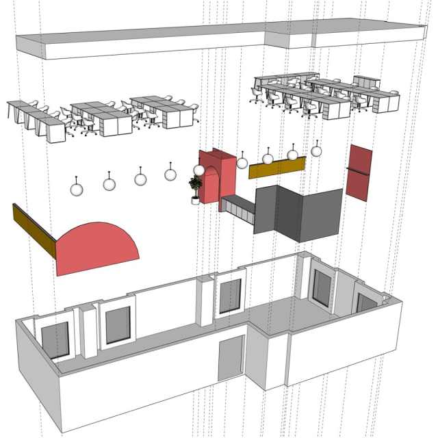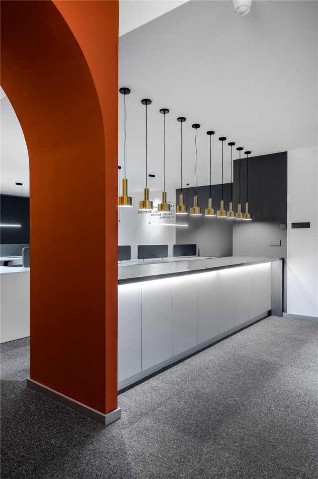 在功能区域的划分上,我们使用了一个大的拱形门洞,把整个空间划分成两个部分,区分满足两个主要的职能部门。