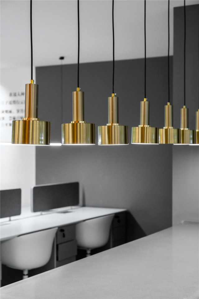 虽然面积只有100平方米,我们还是坚持做了一组四米长的吧台,并且配了金色的小吊灯,可以让员工们在这里轻松地享用咖啡和茶。同时增加了储物空间。
