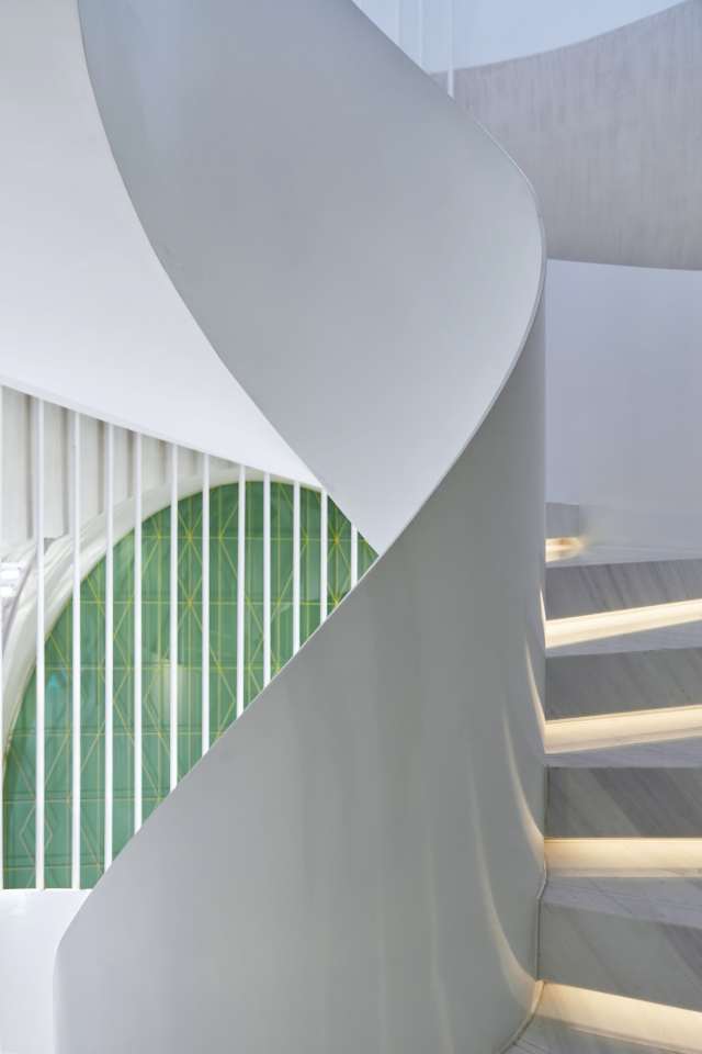 白绸缎般自然回环旋转的楼梯,可静观,可动赏;可铺底衬托,可独立成景,却又寂静平和,烘托出间接空灵的气质。不张扬,不喧嚣,与暖色的灯带碰撞融合,宛若绝美艺术品。