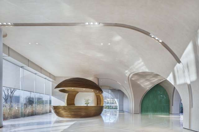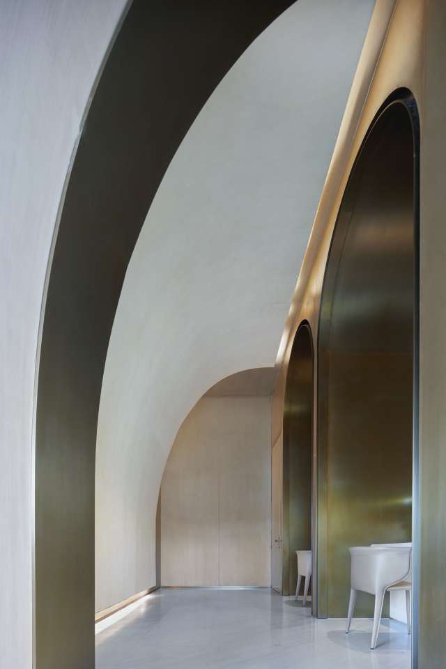随空间气氛而起伏的优雅弧线中,射灯镶嵌其中,不露声色地隐匿在顶部上空。拱券结构带来丰富的层次体验,如多幕剧戏剧的低调出演,一幕一幕地表达出空间内涵。