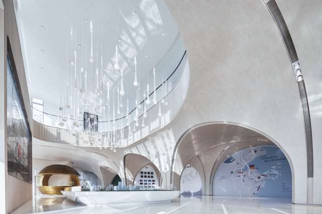 沙盘区的上空,水滴型的吊灯错落排布,如水母般浮游于空中,以当代艺术手法呈现宁波独特的地域文化。有节奏的空间,层层递进、分区细腻,满足不同场景化的功能需求。