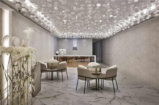 心灵凝定以沉淀,沿着墨晕地坪前行,设计师采用多种白净语汇;悬挂天幕的安静气泡,或透明或纯白,有如温柔的情绪粒子,释放于空气当中,轻轻滤过镶嵌其上的洁白光源。一楼接待大厅全区铺设同质地坪,由门外延连入室,与天壁选配相应色系,极尽创造延伸视感之余,更将洽询柜台、会晤区块及展示柜有序地置入其中。柜台选用天然石材基底,搭佐钛金介面与间接灯源,内敛地彰显出柜体的完美比例;此处特点亦引伸向右侧展柜,复古镜搭配简洁镀金线条,以细腻而多层次的手法萃取空间精华,修护所有衰疲的身心灵魂。