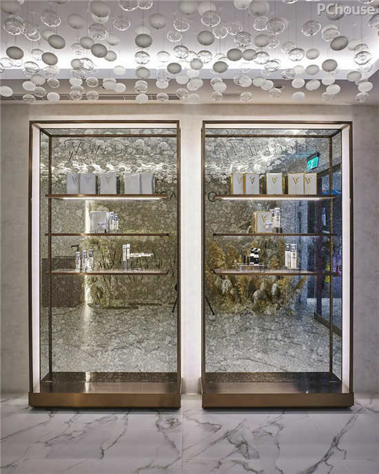 上层廊道壁面与天花板採取部分镂空设计,丝绒般的灯光飘逸,塑造轻盈无压的视觉感受;而沿途镶嵌的开放式展架,则设以清玻表面,使其内精品由内而外地透亮陈列。依循人员引导,回归个人独立修复室,此处贴陈带艺术纹理的壁纸以润泽场景,再依据各别机能进行细致风格调整;如采用古典元素与木质软化高科技舱室的冷硬感,抑或节选復古灯镜与拱形线条妆点摩登风情,为这座秾纤合度的量体身形,添加立体且鲜明的人物风采!