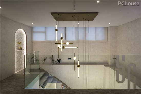 楼梯作为串连上下层的重要动线,团队为其摒除传统厚重观感,改以清玻扶手、清丽石阶,映衬轻和重、虚与实的美感对比。沿阶攀登上层,肌肤便能自然感受到四面涌上的美感体验——垂坠流连于楼层间的设计吊灯,回归简约的线面单位,连通场景而后聚拢关係,静而不喧地雕塑出柔美主题;接着迎来有如流体画般的端景设计,素雅泥白融混金漆,应和拱门边缘的镀钛质地及当央摆设的小巧花艺,悄悄为场域穿戴上质调奢华的晶丽饰物。拾阶而上,二楼廊道则沿袭入门的无暇记忆,挂搭温煦且遮光度十足的暖灰布帘作为隔间,既为接下来即将到达的私人保养区域,保留令人安心的温度,亦顺而造就晋身美丽的通道风景。