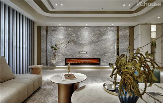 样品屋的访客往往抱持懵懂期待踏入空间,敞朗大气的天壁与大片石墙,则能紧紧攫获初来乍到者的目光,其泼墨般的纹理由中心向两侧晕染,在张扬性格下保有留白底蕴,与同色系的地毯建构起客厅的无形疆界。而材质截然不同的木质单椅、麂皮椅凳与金属感边桌,以同样圆润的身形,为方正格局添入丰富的视觉体验,任意躺卧沙发,便能在大面落地窗投入的光线中,欣赏富有深意的美。