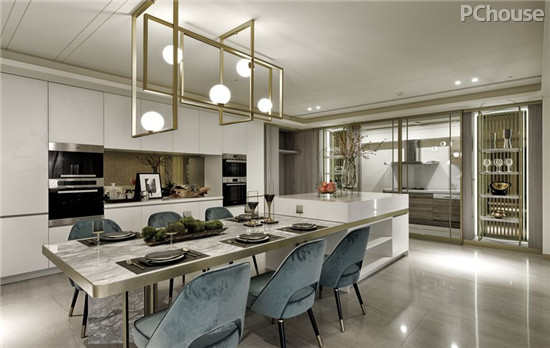 转入餐厨空间,造型特出的主灯闪耀着冷调的暖光,在以白为主调的场域里,宛如黎明的朝辉,演绎着优雅;而为区隔机能,设计师特别划设电动玻璃拉门,使烹煮同时能杜绝油烟,让主人能从容备菜及用餐,形构一幅温馨的聚餐场景。