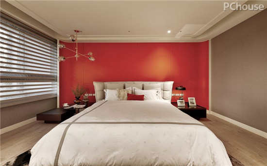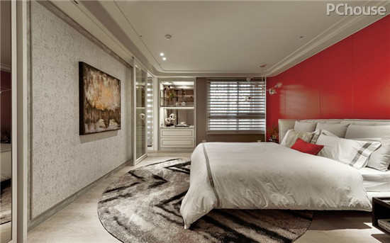 环状天幕围出趣味层次感,足见设计师善用软件与硬装的组合来铺垫空间氛围——以色调相似,却样式迥异的墙面、挂画及地毯,对比撷取客厅火红元素拼贴成的主墙,创造出纹理纷呈与热烈纯粹并存的场域,让访客感受到异于其他区域的视觉冲击,留下深刻的印象。