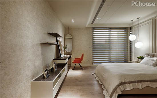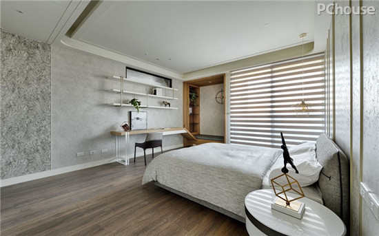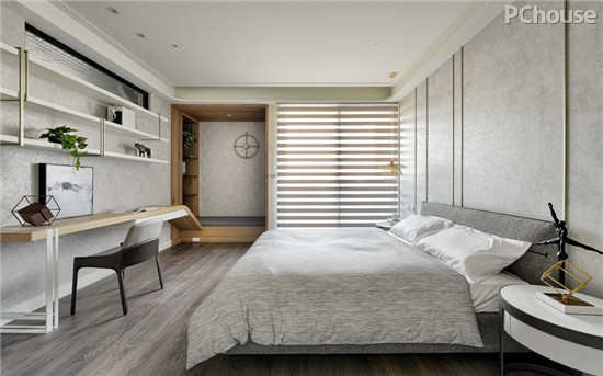 木质书桌一路向前延伸,宛如滑梯般垂下的平滑曲线,与兼具展示柜功能的卧榻区相连,灵巧的为主人打造极具弹性的使用空间。采用简单线板修饰的主墙,其垂直线条延展了壁面的视觉效果,并于轻柔浅灰色调的卧室内,形塑一体成型般的舒适慵懒,当阳光从窗外洒落,便成为令人身心放松的休憩场所。