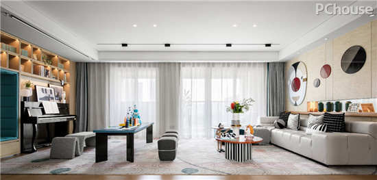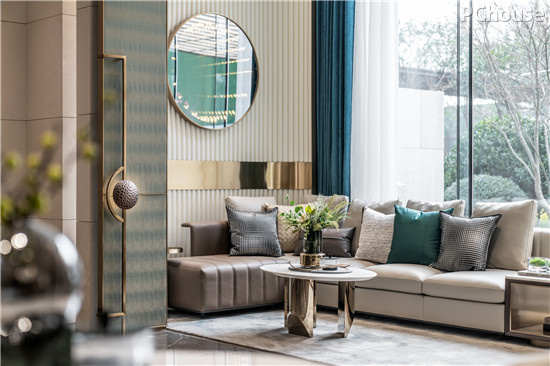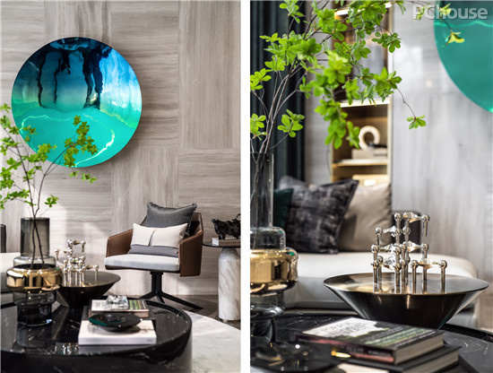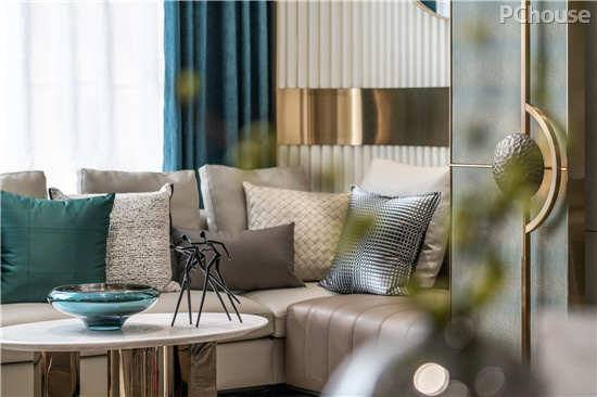 临窗一隅是沙发区的构设,设计遵循对称的美感。L型皮质沙发上点缀青、灰、白相间的靠枕,温润明朗;墙面的挂件装置对映彼此,光影相衬,营造“湖光秋月两相和”的生趣光景。
