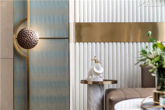 石材、木质、金属、玻璃、皮质……用材的选取以趋于自然的色泽构筑,将空间情调归于安宁与晴暖,而设计的风格于简约中融入些许复古元素,打造空间精睿的品质感与现代摩登气质。