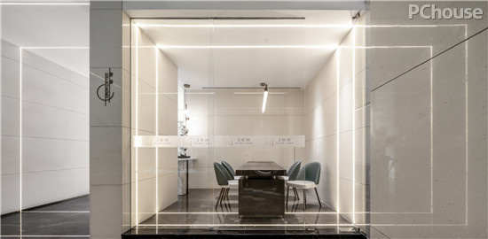 洽谈区以秩序感排布,空间调性在碧色与牙白的交映中,展现艺术的秩序感,清灵莹洁的气质美学于细节之中透漏开来。设计以一列轻盈灯饰作为空间隔断,层叠有致的圆月形态,营造意韵之深浅有余。独特的雕塑摆设,表达静旎平和的空间语境,描摹出人与自然和谐、纯粹的共生之美。