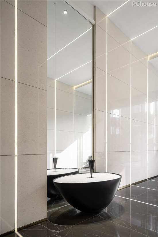 沙盘的造型宛如轻盈的玉盘,与天窗的形态在立体视像上互为映衬。水吧台后的艺术玻璃墙面,通过打磨等现代工艺技术,抽象展演月下波光潋滟的景象,空间在一片清雅之中,予人空灵澄澈的美感。