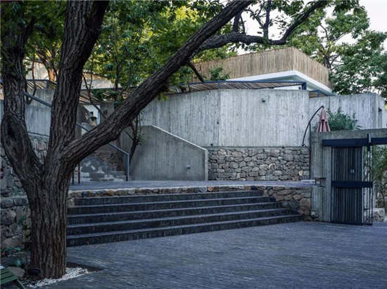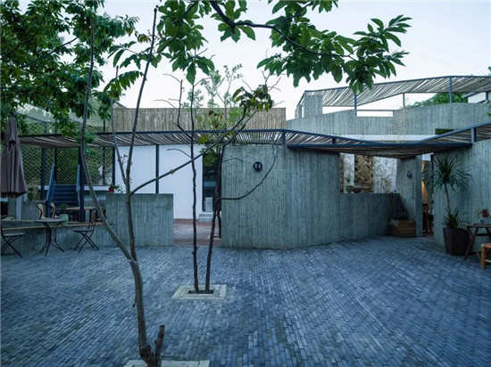 场地背山面山,远处有松景。院墙的形态以保留原有大树为基础,院内交通通过各自的楼梯解决。院子以竹棚相连,半掩蔽之,避免内院过于闭塞。院墙以竹模混凝土浇筑形成,台地部分以石头墙垒起,独立的内院铺有红色渗水砖,公共的平台以青砖铺之,材料选用希望契合周边自然山体和各个庭院的氛围。