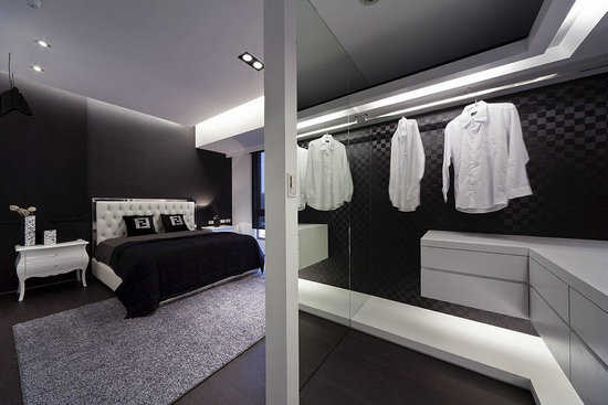 编辑点评:贴心考虑到不缩减卧房的走道宽度,以不锈钢仿造格栅的形式,丰富电视墙造型。探入黑色线帘内的更衣室,几何灯箱为走道与更衣室的共用介面,在此成为增添氛围的照明灯。