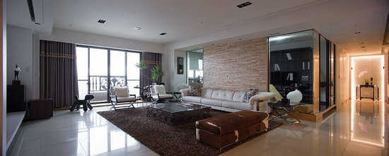 编辑点评:大坪数的场域中,设计师只将客厅与书房间的隔间墙,从厚实的水泥墙面,改成清朗的玻璃隔间,让视野可从玄关处,穿透橡木集层特殊版两侧的玻璃墙面,直达后方书房的大型书架。