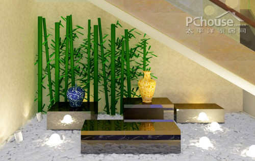 楼梯属于室内空间中比较曲折狭窄难以处理的角落,可以通过一些自然景观的设置加以遮挡和隐蔽。如此一来,既美化了客厅又不妨碍空间的利用,LOFT式住宅楼梯下空间狭小,利用率不高,一个小型水景的设置,或者配以几棵绿植再将天然的石材点缀在地面上,或者摆放精致的艺术品,既利用了室内角落又增添了室内空间的情趣。