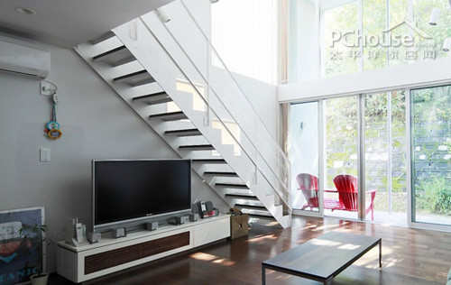 如果楼梯在客厅非常显眼的位置,楼梯下的空间更是要好好利用。电视柜和电视机按照楼梯下的空间特别定制,空间得到了有效利用,而且看起来非常有设计感,空间也显得简洁清爽。