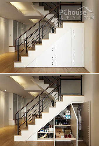 楼梯因为它的外形而占用了不少有用空间,在多数的家庭里,通常都将其下方的空间作为储藏物品之用。例如,可以加装一扇门,里面摆上几个储物箱,分门别类地收藏东西。另外,还可以根据楼梯台阶的高度错落,制作大小不同的抽屉式柜子,直接嵌在里面,可摆放不同物品。