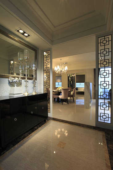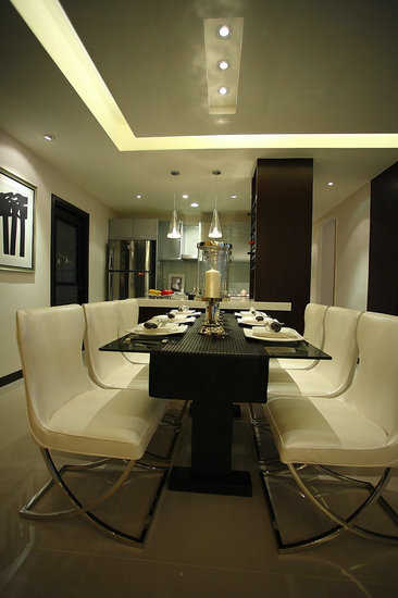 编辑点评:完整延展至餐厅的天花板,为了不至于显得繁复,改以嵌灯做为主要照明。岛吧旁设计藏有发光设备的酒柜,烘托酒瓶的高贵质感;并双向利用于走道,改为美丽端景。