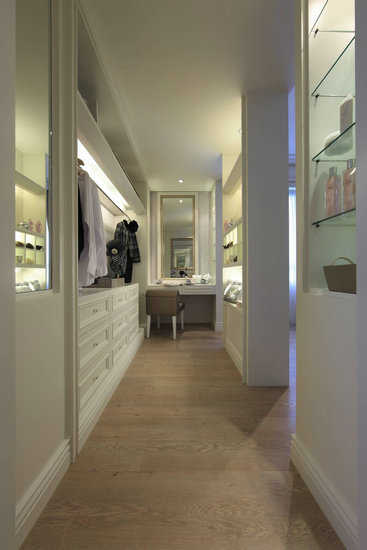 编辑点评:预定做为影音墙,同时也是空间的界定,考虑两旁走道并不宽敞,特以镂空方格降低压迫感。挂衣区上方暗藏灯管,衬托出有如精品专柜的气氛。