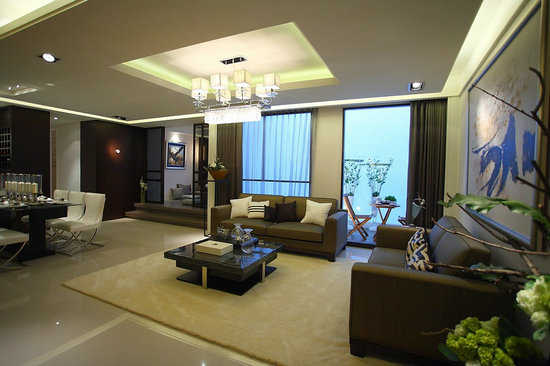 编辑点评:为修饰横在正中央的结构梁,天花板一气呵成的延展,上升天花搭配主灯的立体层次,又再次将屋高显现。