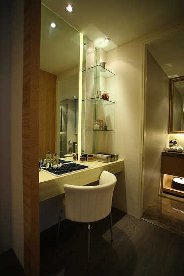 编辑点评:善加利用角落空间,玻璃层板使女主人便于收纳保养品瓶罐。