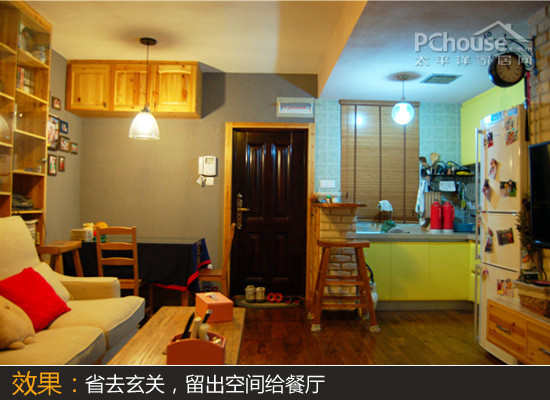 解释:小户型面积不大,省去了传统的玄关,进门左侧是与厨房吧台相连的小鞋柜。