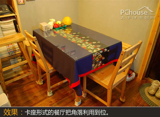 解释:进门右侧小角落是餐厅,小户型用矩形餐桌能最大限度节省空间。餐桌餐椅全部使用原木设计,刷上木蜡油。豆爸还特有心思地铺上了有民族风情的桌布。所有桌子椅子的脚都套上布套,防止木与木之间刮掉木蜡。